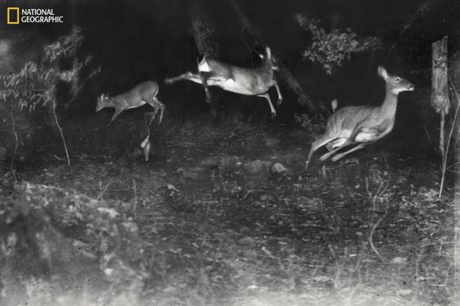 在密歇根州的树林里,相机陷阱首次捕捉到野生动物的夜间影像。早期设备使用玻璃底片和镁光灯。图片来源:George Shiras III / National Geographic