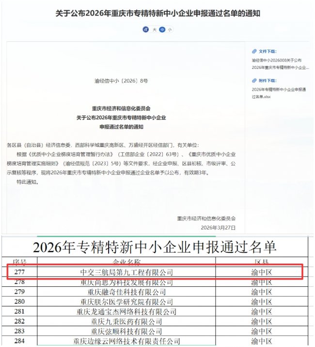 近日,重庆市经济和信息化委员会发布2026年重庆市专精特新中小企业认定名单,中交三航局九公司凭借在交通基建细分领域的技术积累和创新实力,成功获评重庆市“专精特新”中小企业。
