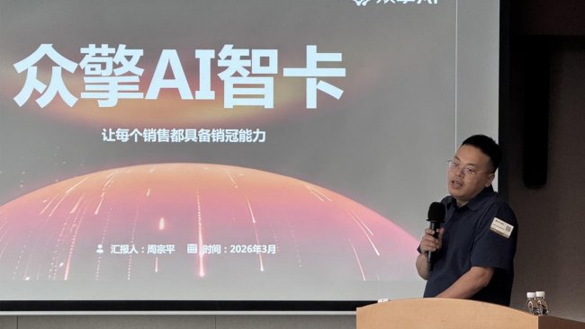 众擎AI松山湖研发中心周宗平介绍了该产品,他表示众擎AI智卡深度集成腾讯ASR精准语音识别能力,实现会议实时转写、智能提炼总结、一键生成报告,让会议效率提升90%以上,助力销售团队高效沉淀经验、快速成长为销冠。
