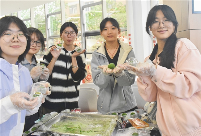 艾草的清香与馅料的甜香交织弥漫,一枚枚碧绿圆润的青团陆续出炉,既藏着江南春日的时令滋味,也承载着中华传统文化的深厚底蕴。大小不一的青团,恰似一张张风格各异的青春答卷,记录着学子们的专注与热忱。大家捧着自己亲手制作的青团,脸上洋溢着成就感与喜悦之情,纷纷拍照留念,定格这一温馨美好的瞬间。