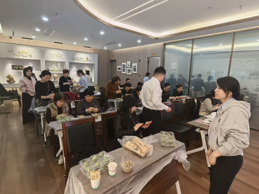 活动现场暖意融融,充满了传统节日的烟火气。工作人员提前准备好艾草、糯米粉、馅料等食材,邀请专业师傅现场教学,从揉面、包馅到成型、蒸煮,一步步指导客户亲手制作清明果。大家围坐在一起,揉面团、包陷料、捏造型,欢声笑语不断,在亲手制作传统美食的过程中,感受清明时节的民俗文化,邻里般的互动让现场氛围温馨又热闹。不少客户一边制作,一遍分享自家的清明习俗,在轻松愉快的氛围中,拉进了银行、保险机构和客户之间的距离,增进了彼此的信任与感情。