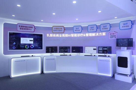 整个展区的明星是今年推出的国内首个多模态、全流程、软硬件一体的乳腺疾病AI诊疗 & 管理智能解决方案,乳腺癌诊疗流程为核心,通过场景化、一体化的沉浸式体验,呈现了乳腺诊疗一体化全流程AI解决方案,将智慧筛查、精准诊断、高效治疗、科学随访与临床科研有机融合,通过整合AI影像、AI辅助决策、术中切缘评估和患者管理系统,构建覆盖筛查、诊断、治疗与康复管理的完整诊疗体系,以更落地、更贴合临床的全链路AI能力实现乳腺癌的全周期管理。 这一方案打破了传统诊疗的碎片化模式,构建起从院前预防到院后管理的完整闭环,助力临床科室提升诊疗效率与科研水平,真正以智慧医疗守护女性健康。针对肺癌、肝癌等高发癌种,深睿医疗同样打造了覆盖全流程的AI诊疗解决方案,实现多癌种智慧诊疗闭环全覆盖。
