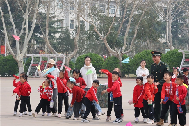 “放飞梦想”环节,学员们蹲下身,握着孩子们的小手,将“我要当解放军”“保卫祖国”等稚嫩的梦想写在彩纸上,折成纸飞机。当数十架纸飞机迎着国旗方向一同放飞,孩子们欢呼着追逐,小小的身影与学员们挺拔的军姿构成一幅温暖画面。