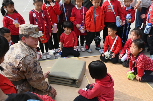 春日暖阳下,学员宿舍楼前的水泥地上,一群身着常服的军校学员正手把手教幼儿园小朋友叠“豆腐块”被子;操场上,无人机腾空而起划出优美弧线,孩子们的惊呼和掌声此起彼伏……近日,陆军工程大学石家庄校区某学员队与金戈幼儿园联合开展“萌娃进军营,童心筑国防”主题活动,通过沉浸式军事体验让孩子们在互动中感受军营魅力,播撒爱国爱军的红色种子。