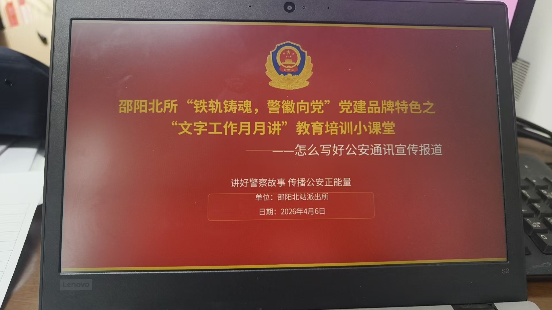 为扎实推进长沙铁路公安处党委关于党建品牌创建的系列工作,2026年4月3日下午3点,广州铁路公安局长沙公安处邵阳北站派出所党支部组织全所青年民警开展“铁轨铸魂 警徽向党”党建品牌创建活动,推出“文字工作月月讲”教学小课堂,计划通过12期教学小课堂,深入讲解公安通讯报道、公安简报、调研、汇报、讲话稿等公文体裁的写作方法和技巧,提升全所民警公文写作水平,着力打造一支提笔能写、遇事能谋、干事能成的青年队伍。