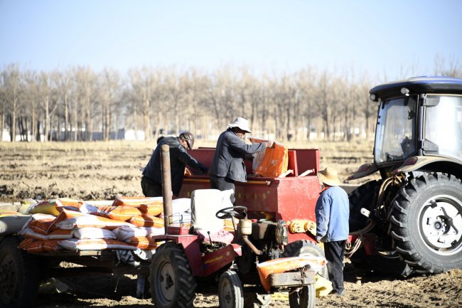 在德令哈市柯鲁柯镇,当地群众在开展播种作业。蔡得军摄