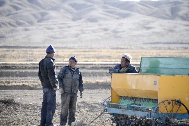 在德令哈市柯鲁柯镇,当地群众在播种期间交谈。蔡得军摄