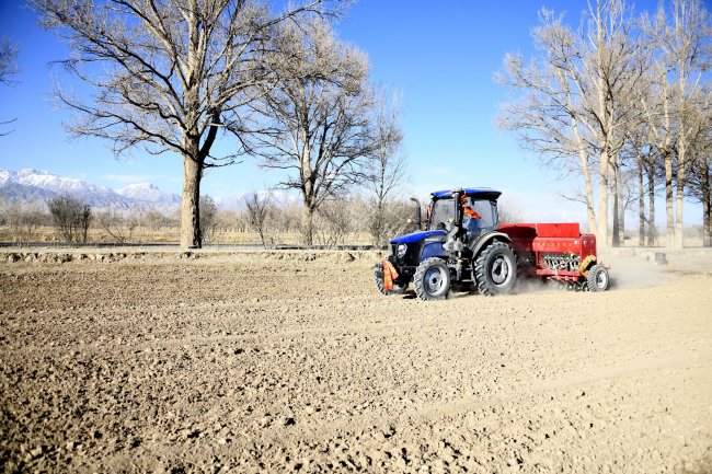 在德令哈市柯鲁柯镇,当地群众驾驶播种机作业。蔡得军摄