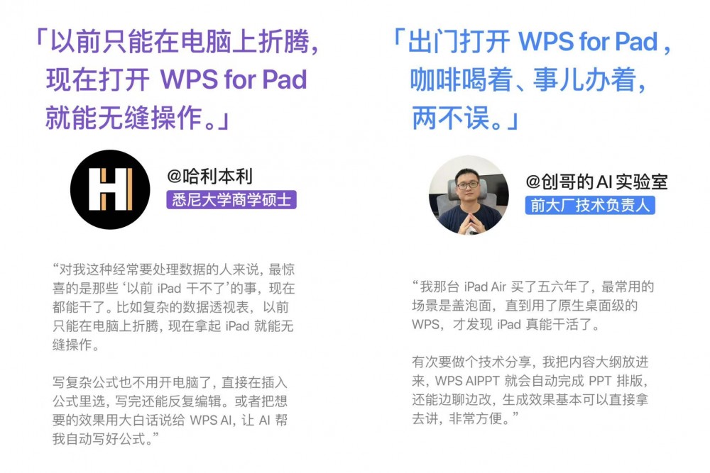 前大厂技术负责人创哥表示:“我那台iPad Air最常用的场景是盖泡面,直到用了原生桌面级的WPS,才发现iPad能真正干活了。有次要做个技术分享,我把内容大纲放进来,WPS AIPPT就自动完成PPT排版,还能边聊边改,生成效果基本可以直接拿去讲,非常方便 。”