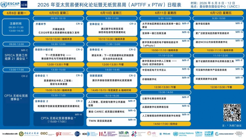 6月8-12日,2026年亚太贸易便利化论坛暨无纸贸易周(APTFF x PTW 2026)将于泰国曼谷联合国会议中心举办。受主办方联合国亚洲及太平洋经济社会委员会(下称亚太经社,英文ESCAP)邀请,中国电子商会正式成为该活动官方合作伙伴,参与企业组织及配套活动举办等相关工作。
