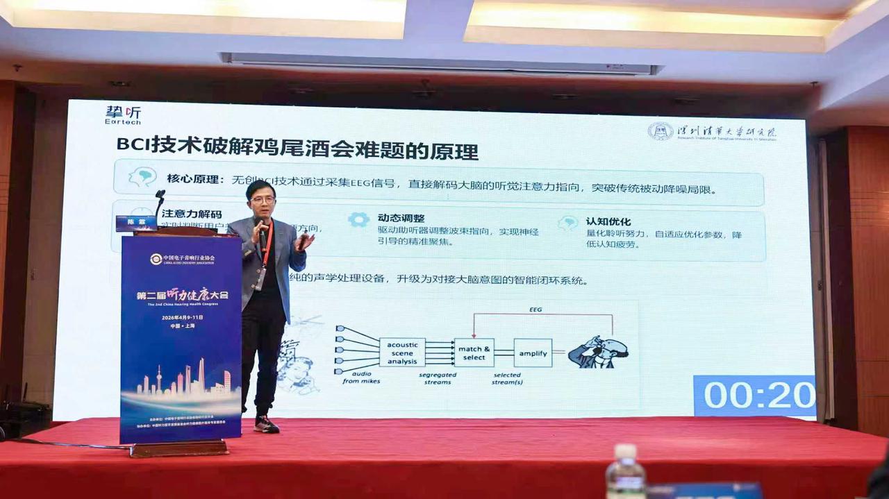 2026年4月10日,上海听力健康大会现场,挚听助听器创始人、深圳清华大学研究院研究员、清华大学博士 陈霏发表主题演讲,首次系统阐述无创脑机接口(BCI)技术在助听器领域的应用突破,并展示了挚听在"精准验配"与"言语康复"两大行业难题上的最新解决方案。