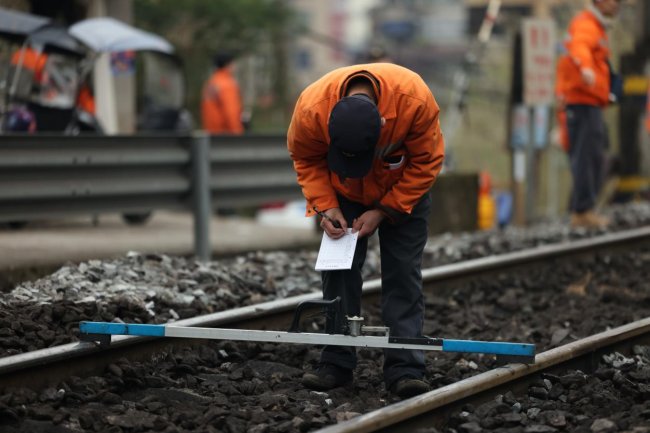 机械轰隆作响,现场难免有尘土飞扬,作业人员们各司其职,默默坚守在岗位上,与灰尘、油污为伴,认真完成每一项作业任务。永安线路车间检查工区的何骏、王志强分工明确、配合默契,何俊紧盯轨检小车跳动出的各项数据,及时提醒现场作业人员调整;王志强则手持道尺,沿着作业线路逐步推进,每隔一段距离便弯腰测量,仔细记录轨距、水平等数据,确保每一处参数都符合标准。